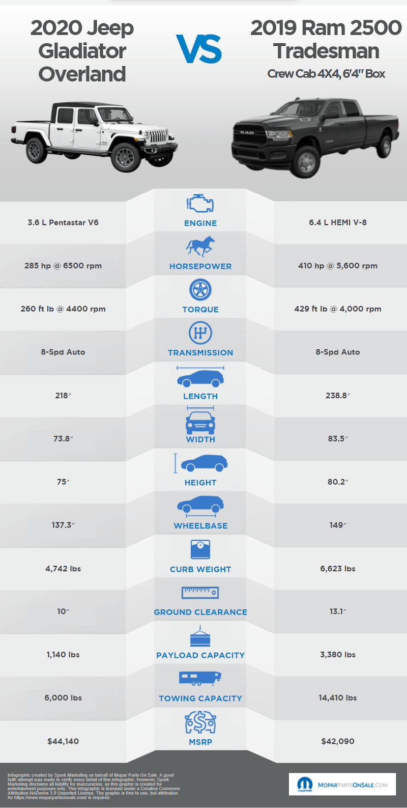 There's lots of talk about the new Jeep Gladiator Overland and how it compares to other trucks, especially the 2500 Ram Tradesman. We heard that talk and decided to put it all down in black and white to see exactly how the two stack up to each other.