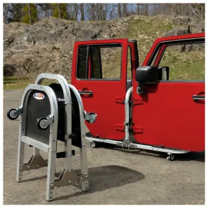 - Description: Sold by EZ 4x4, the silver Aluminum Four-door Folding Rolling Door Cart makes life simple for Jeep® owners looking to remove their doors. Take your Jeep ® Wrangler or Gladiator doors off anywhere, roll them to your storing area, and simply fold the holder for compact storage when you're done. The cart comes equipped with universal casters with brakes for safer storage.