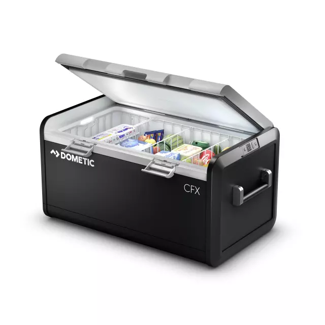 - Description: CFX3 100 Powered Cooler is Dometic’s largest electric cooler at 99L. Ideal for trailer slide outs, pickup truck beds, and RVs. The large 12v portable fridge reaches temperatures as low as -7°F, while using less power than a 60W light bulb. The high-performance Dometic CFX3 series is constructed with lightweight, durable fender frames and strong aluminum alloy handles, while the compressor is built with noise and vibration reduction. Utilize the easy phone app for temperature monitoring and control without touching the car fridge.
