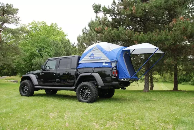 - Description: The Napier Sportz Truck Tent allows you to set-up camp in the back of your pickup truck in under 15 minutes, creating a convenient and cozy sleeping area for two. Perfect for a spontaneous road trip, a trek to the mountains, or a day at the beach. Enjoy a spacious interior that offers ample headroom and comfortably sleeps two adults. The color-coded pole system makes set-up a breeze in under 15 minutes. The large 4-foot freestanding awning with adjustable height provides shade and protected area for gear. The cab access panel allows you to access the truck’s interior for storage or power. Features include wide windows, ceiling vents and rear panel for optimal ventilation, and full rainfly, bathtub floor, taped seams, zipper storm flaps and fully sealable windows and vents. The sturdy frame and strapping system keeps you secure in the windiest conditions and the large entry door makes for easy entry and full use of tailgate. This tent is designed to fit compact trucks with five-foot beds.