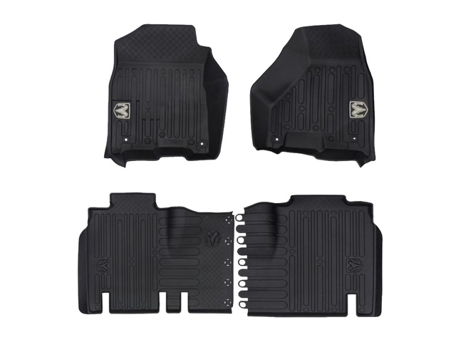 - Description: These black all-weather floor mats feature a robust design made to completely cover the foot well areas in your truck keeping mud and slush at bay. Made to fit Mega Cab vehicles this sets includes two front row mats and two second row interlocking mats featuring the Ram logo. Engineered and designed to fit your vehicle flawlessly.