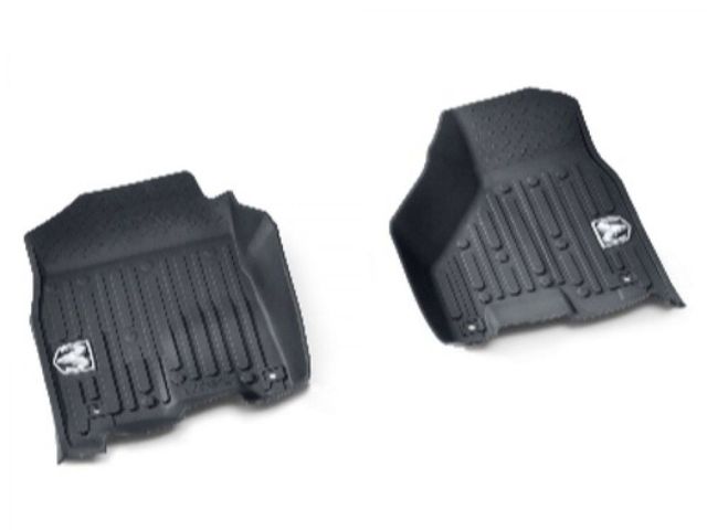 - Description: These black all-weather floor mats feature a robust design made to completely cover the foot well areas in your truck keeping mud and slush at bay. Made to fit Regular Cab vehicles this sets includes two front row mats featuring the Ram logo. Engineer and designed to fit your vehicle flawlessly.
