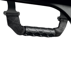 - Description: Grab Handles attach to front seat sport bar. Designed with molded grips and webbing strap, two handles come in each kit, one for the driver's side and one for the passenger's side. These handles fit Jeep Wrangler Unlimited (four-door JL version) equipped with power top.