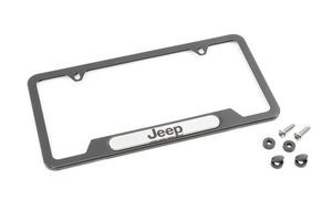 - Description: Your Jeep vehicle awaits your personal finishing touches. This Black powder-coated 304 Stainless Steel Jeep logo license plate frame provides just the opportunity. This one has two top holes and comes complete with matching finish hardware hider caps. Fits all Jeep vehicles.