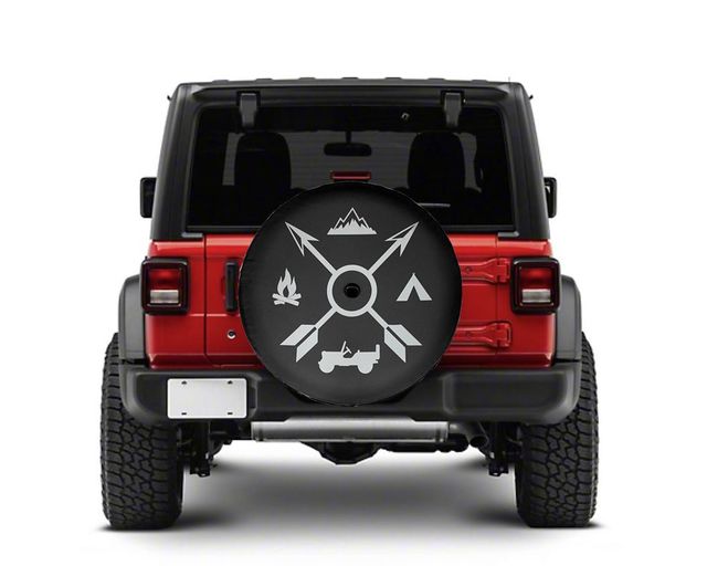 - Description: Spare Tire Cover for 32" tires. Cover is made of Black Vinyl and features a camping-themed image. It fits 245/75R17 and 255/70R18 tires and is compatible with rear view camera. Fits Jeep Wrangler (JL).