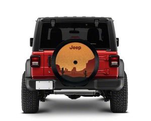 - Description: Spare Tire Cover for 32" tires. Cover is made of Black Vinyl and features a desert-themed logo. It fits 245/75R17 and 255/70R18 tires and is compatible with rear view camera. Fits Jeep Wrangler (JL).