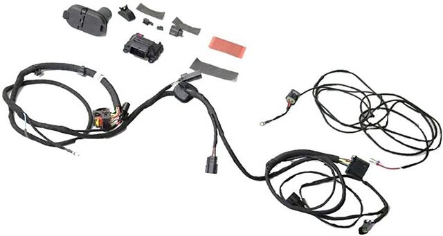 - Description: Trailer Tow Wiring Harness includes seven-way and four-way trailer connections. Wiring supports trailer traffic lighting stop, turn, reverse, and park. Kit includes harness, module, and 4/7-way adapter.