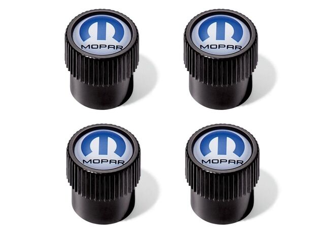 - Description: Made from lightweight ABS these black valve stem caps feature a blue Mopar logo on a white background and are the perfect finishing touch for your wheels. Featuring high-detail graphics under a protective doming and an internal O-ring type seal, they will help ensure the proper functioning of your valve stems without interfering with TPMS signals. Sold in sets of four.